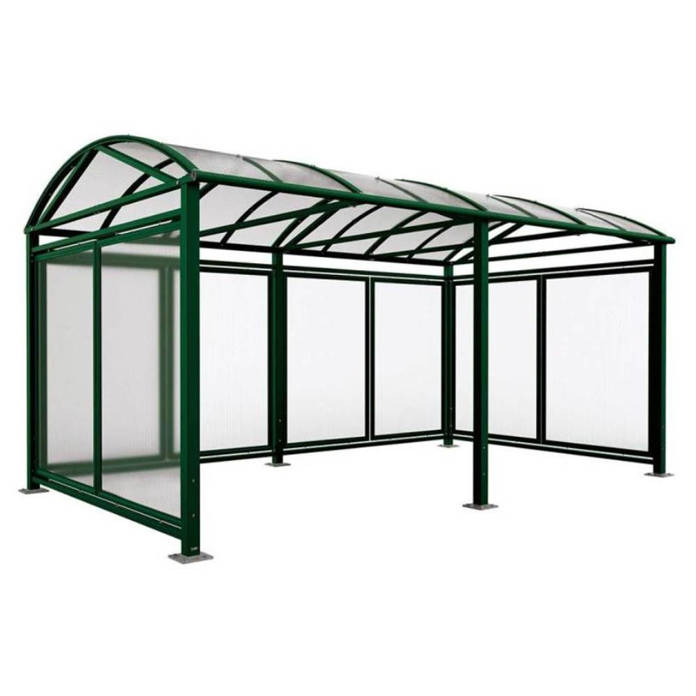 - Toiture : traverses en acier 60 x 40 mm et gouttières en aluminium, peintes selon nos coloris, voûte en polycarbonate alvéolaire épaisseur 10 mm traité anti-UV avec protection contre l'eau de pluie