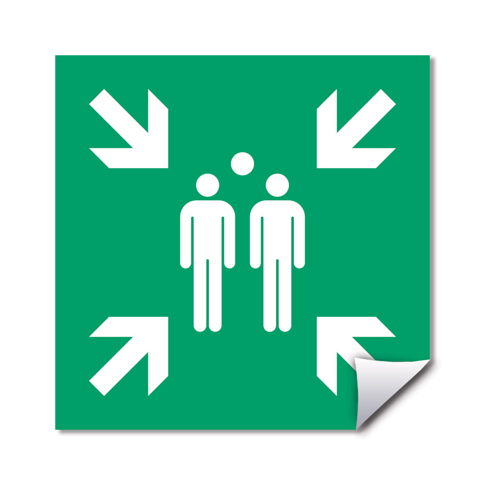 Autocollant Point de rassemblement à coller au sol en vinyle adhésif laminé antidérapant. À poser sur un sol propre, lisse et sec en intérieur. Côté de 500 mm. Picto ISO 7010 E007.