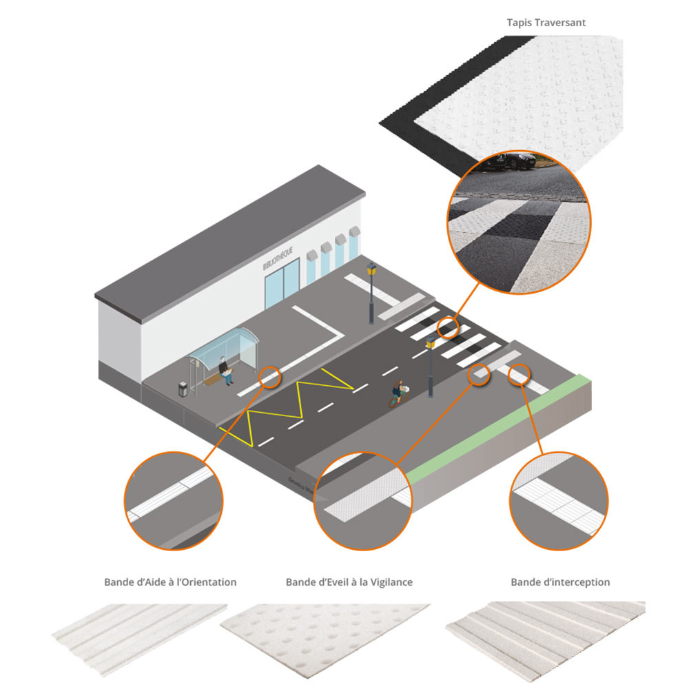 La bande d'interception facilite l’orientation des personnes, notamment en situation de handicap visuel, dans les espaces extérieurs. Elle permet de signaler un point clé du cheminement (passage piéton, entrée d’établissement…) et d’indiquer la direction à suivre. Positionnée en complément d’une bande d’éveil à la vigilance (BEV), elle aide à localiser précisément la zone à atteindre ou à traverser.