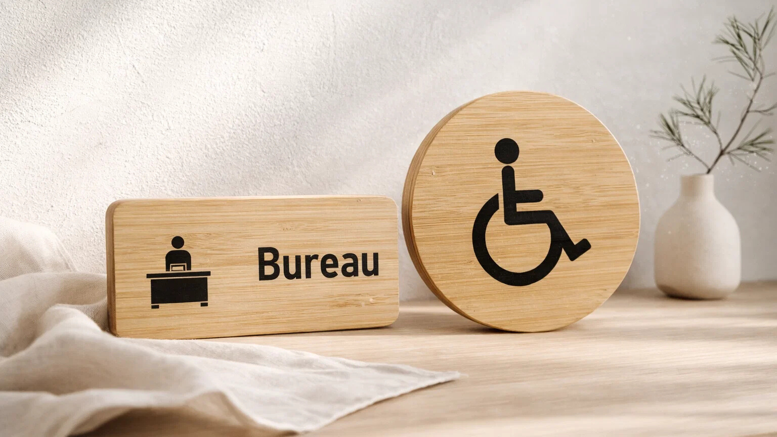 Déclinée en formats ronds ou rectangulaires, la gamme permet de signaler différents espaces : sanitaires, bureaux ou zones dédiées, tout en conservant une cohérence visuelle. Le bambou apporte une présence douce et naturelle, tandis que les pictogrammes ou textes noirs structurent l’information sans alourdir l’ensemble.
