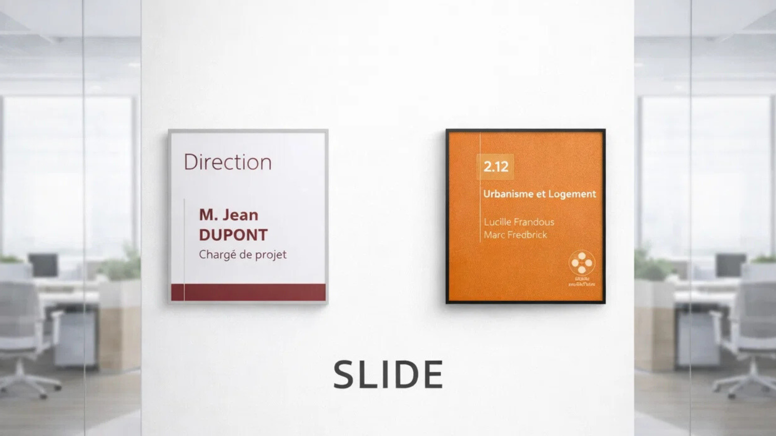 La gamme Slide propose une signalétique de porte modulable, élégante et pratique, spécialement conçue pour les environnements professionnels où l’information évolue fréquemment. Chaque modèle repose sur un cadre fin en aluminium et une plaque de protection transparente en acrylique, dans laquelle il est possible d’insérer ou de faire glisser très facilement un document papier pour modifier instantanément le visuel ou les indications affichées, que ce soit un nom, une fonction, un numéro de salle ou des consignes internes.