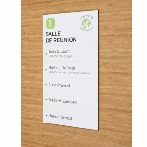 Entièrement personnalisable, la plaque combine une zone principale dédiée à l’identité du lieu (logo, service, numéro) et plusieurs étiquettes magnétiques facilement remplaçables. Cette modularité en fait une solution particulièrement adaptée aux bureaux, salles de réunion et établissements recevant du public, où la signalétique doit s’adapter rapidement aux évolutions internes.