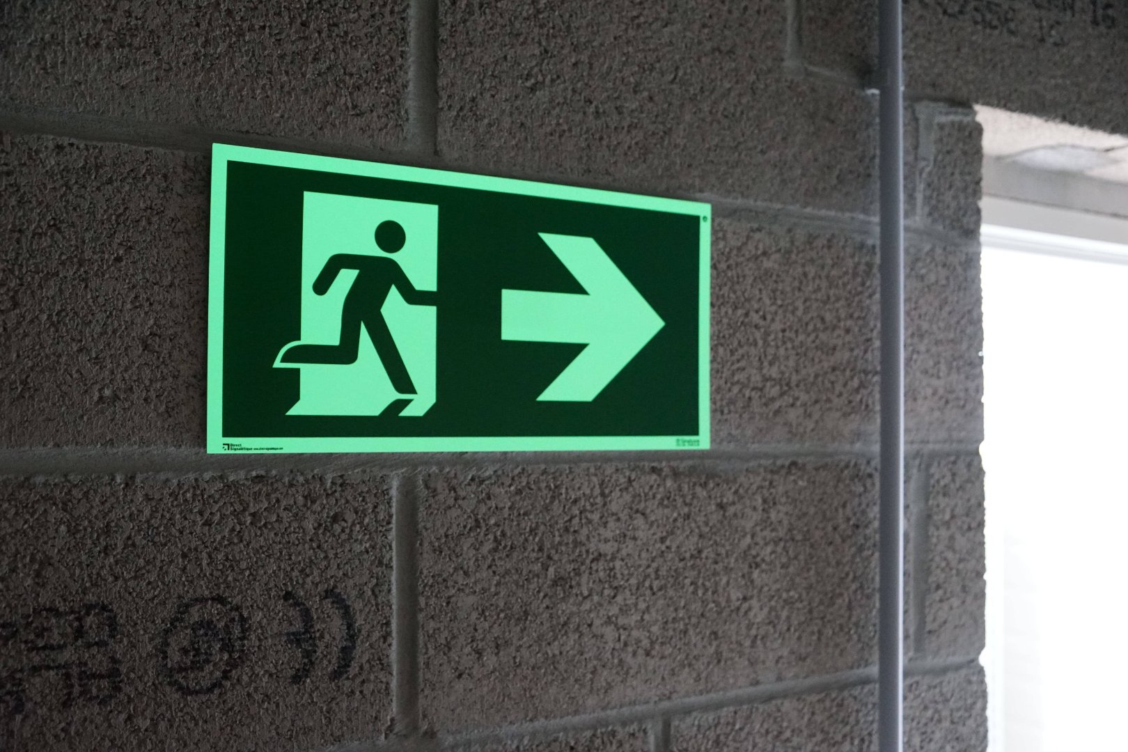 La réglementation impose que les issues soient indiquées de manière continue jusqu’à l’extérieur du bâtiment.