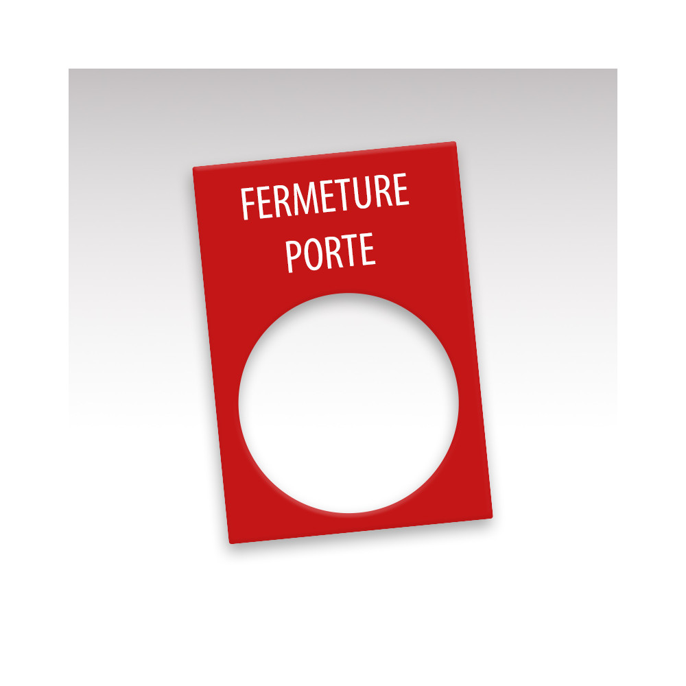 Etiquette télémécanique gravée Fermeture porte en gravoply. Disponible en 1 format : H 40 x L 30 mm, et 2 diamètres de trou de perçage : Ø 22.5 ou Ø 24.5 mm, permettant le passage du bouton poussoir en question. 3 couleurs au choix : fond blanc texte noir, fond noir texte blanc et fond rouge texte blanc. Durabilité dans le temps et résistance à la cassure, aux rayures, à l'eau et aux températures positives allant jusqu'à +60°C vous sont garanties.