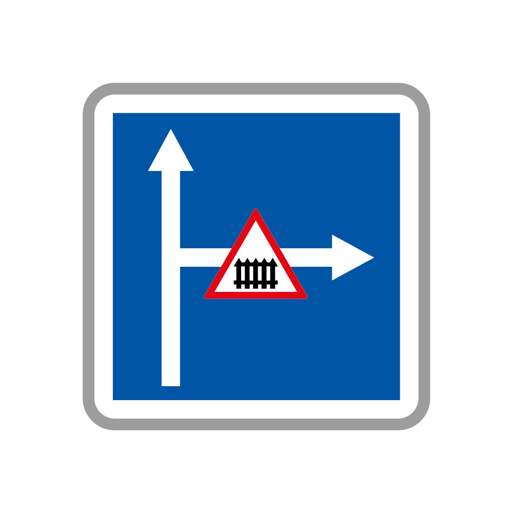 - Modèle : Indication sur le sens de circulation avec des flèches et informe que la prochaine à droite conduit à un passage à niveau.