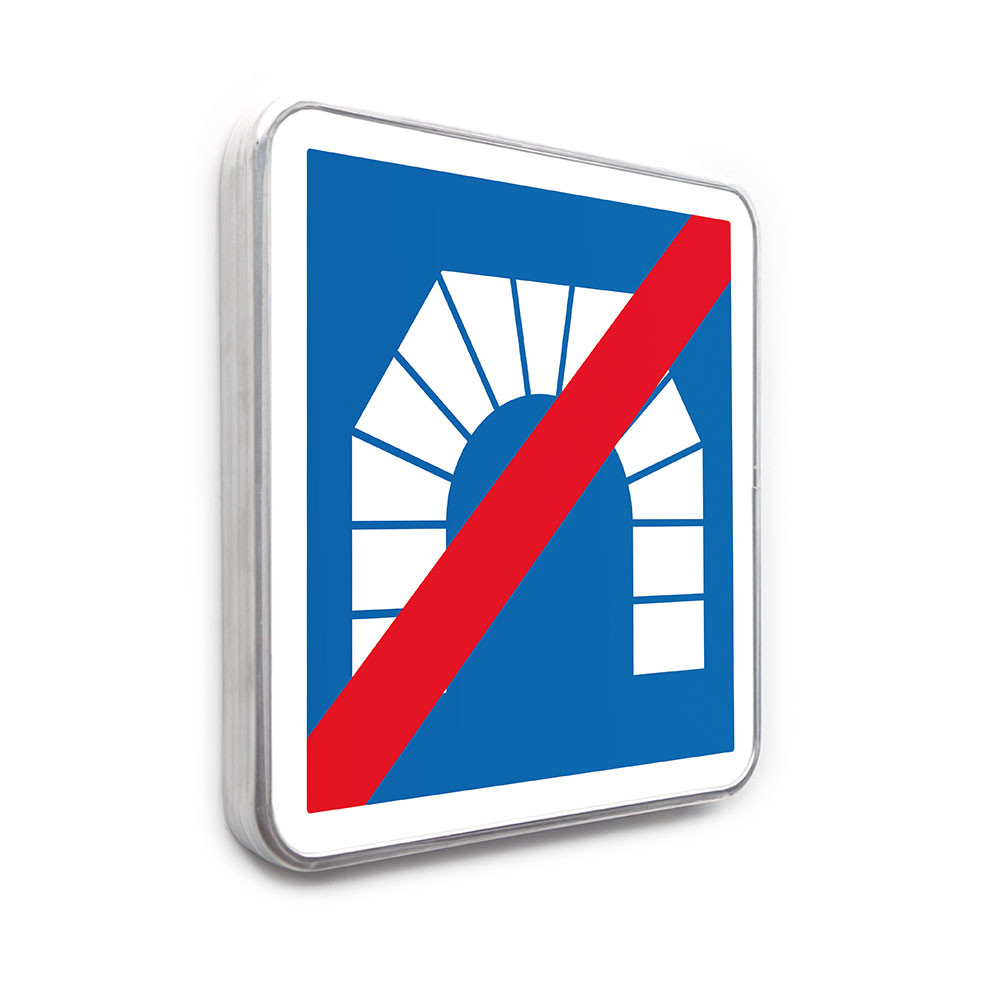 Signalétique carrée avec barre rouge informant les automobilistes de la fin d'un tunnel.
