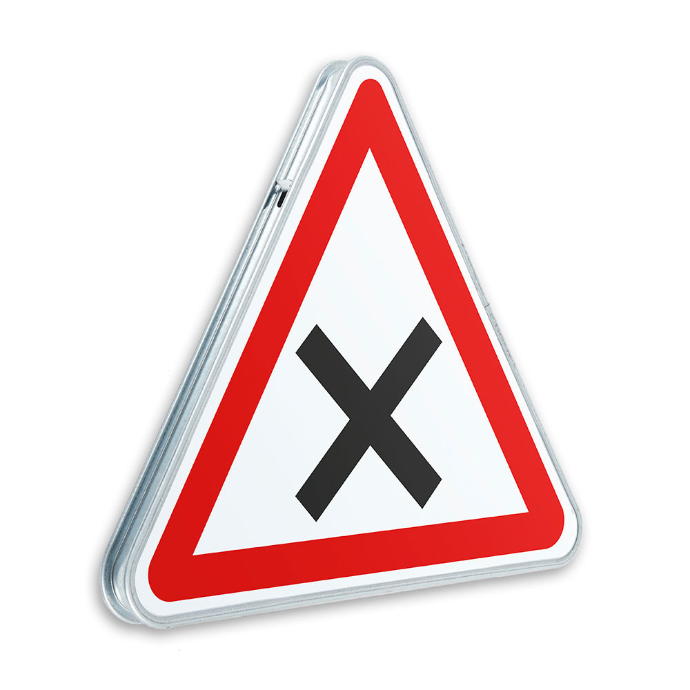 De forme triangulaire avec un fond blanc bordé de rouge, il comporte un symbole en forme de croix noire représentant une intersection classique. Il incite les conducteurs à ralentir et à être attentifs aux véhicules arrivant de la droite. Le panneau AB1 est disponible en plusieurs dimensions et classes de visibilité pour s’adapter à tous les environnements, y compris les zones rurales, résidentielles ou mal éclairées.