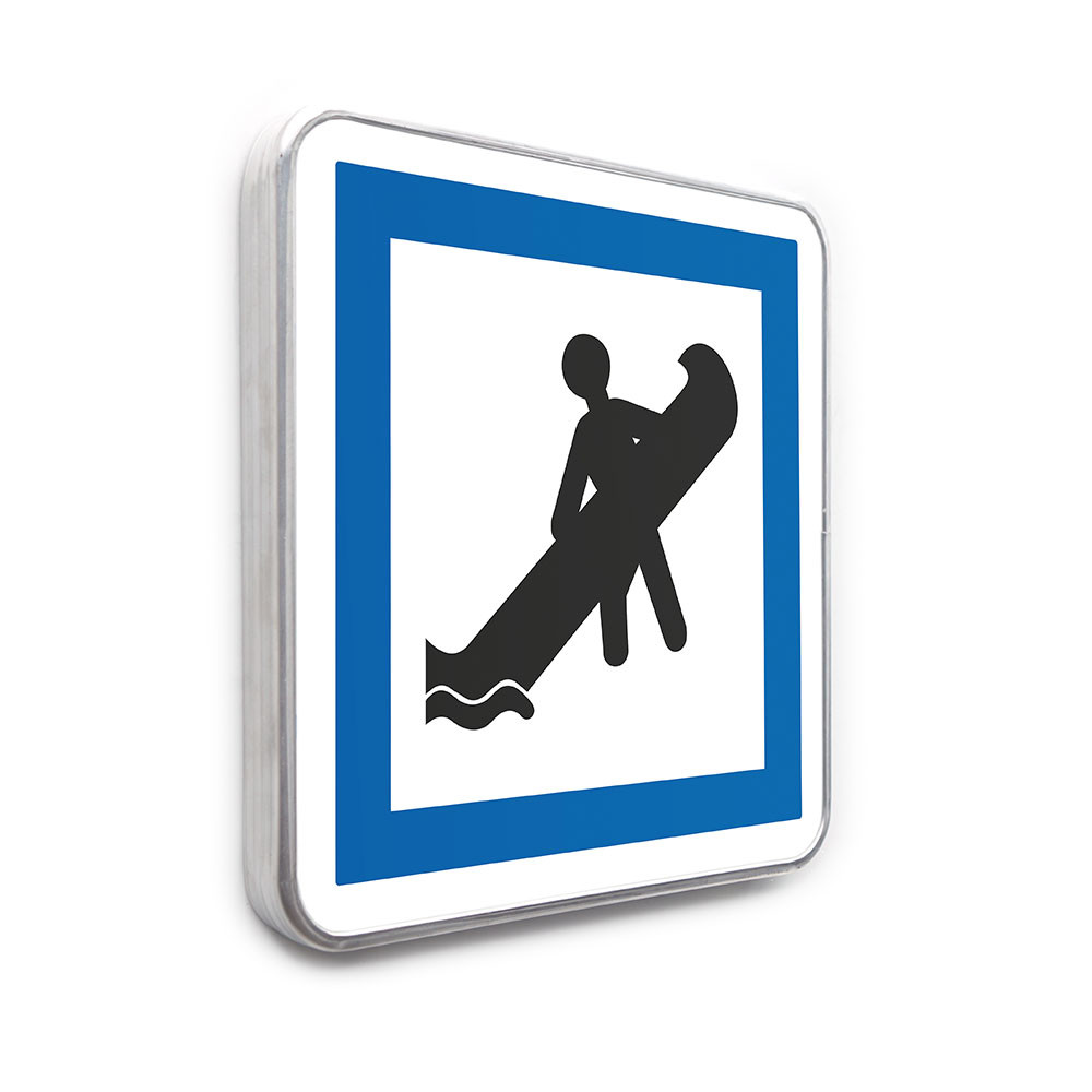 Panneau routier indiquant l'emplacement pour la mise à l'eau d'embarcations légères de type kayak, canoë... Panneau de type police en classe 1 ou classe 2.