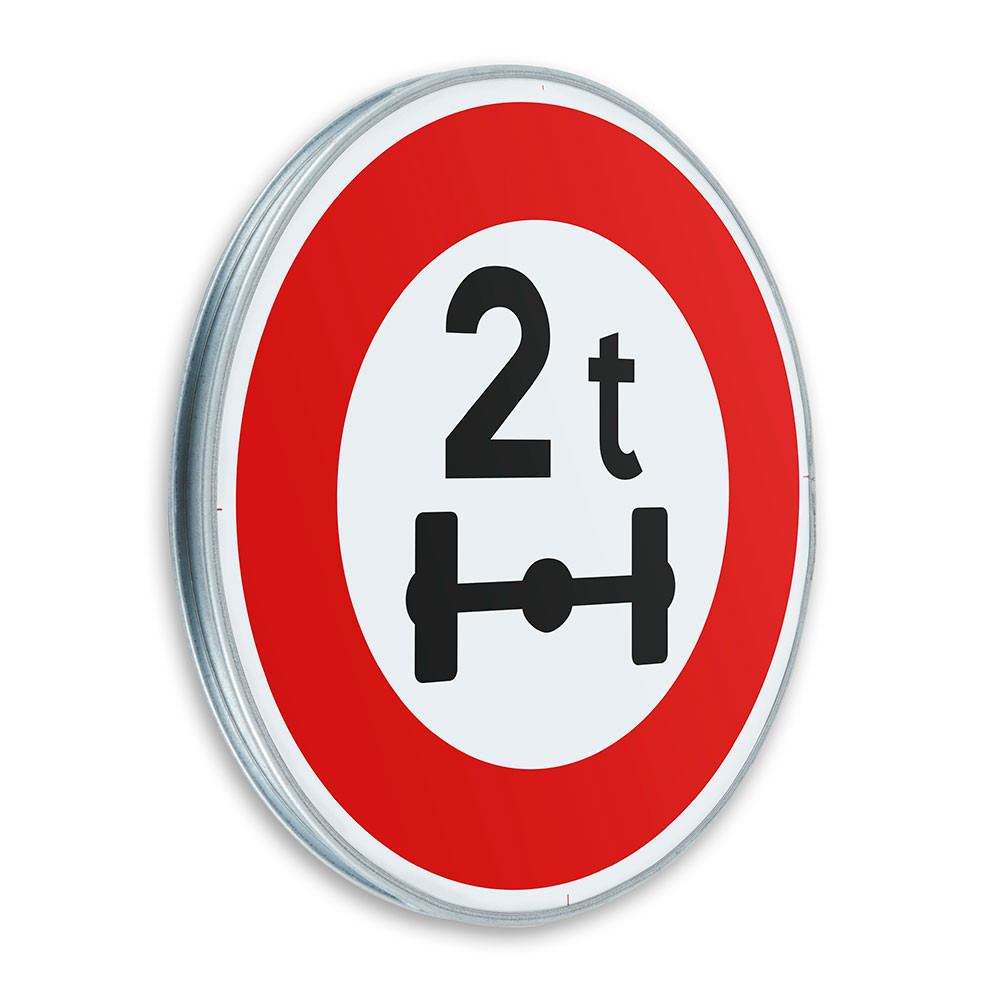 De forme ronde avec un fond blanc cerclé de rouge, ce panneau est identifiable par l’indication d’un poids exprimé en tonnes (ex. “6 t”). Il permet de signaler clairement la restriction et d’éviter les dégradations causées par des charges excessives. Ce panneau est disponible en plusieurs diamètres et classes de visibilité, pour s’adapter à tous les contextes d’installation, y compris les zones à faible visibilité ou exposées aux intempéries.