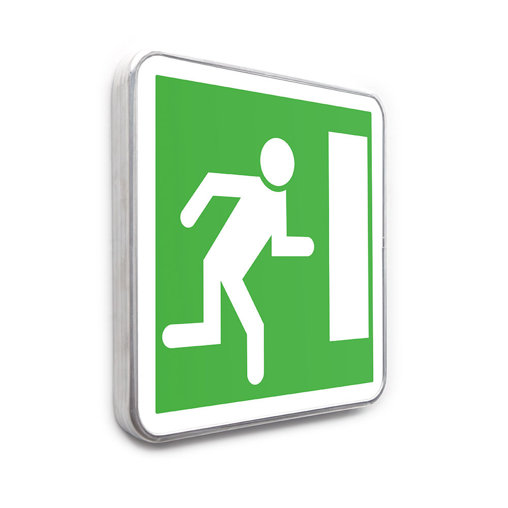 Panneau routier indiquant une issue de secours vers la droite d'un pont ou d'un tunnel. Panneau de type police en classe 1 ou classe 2.