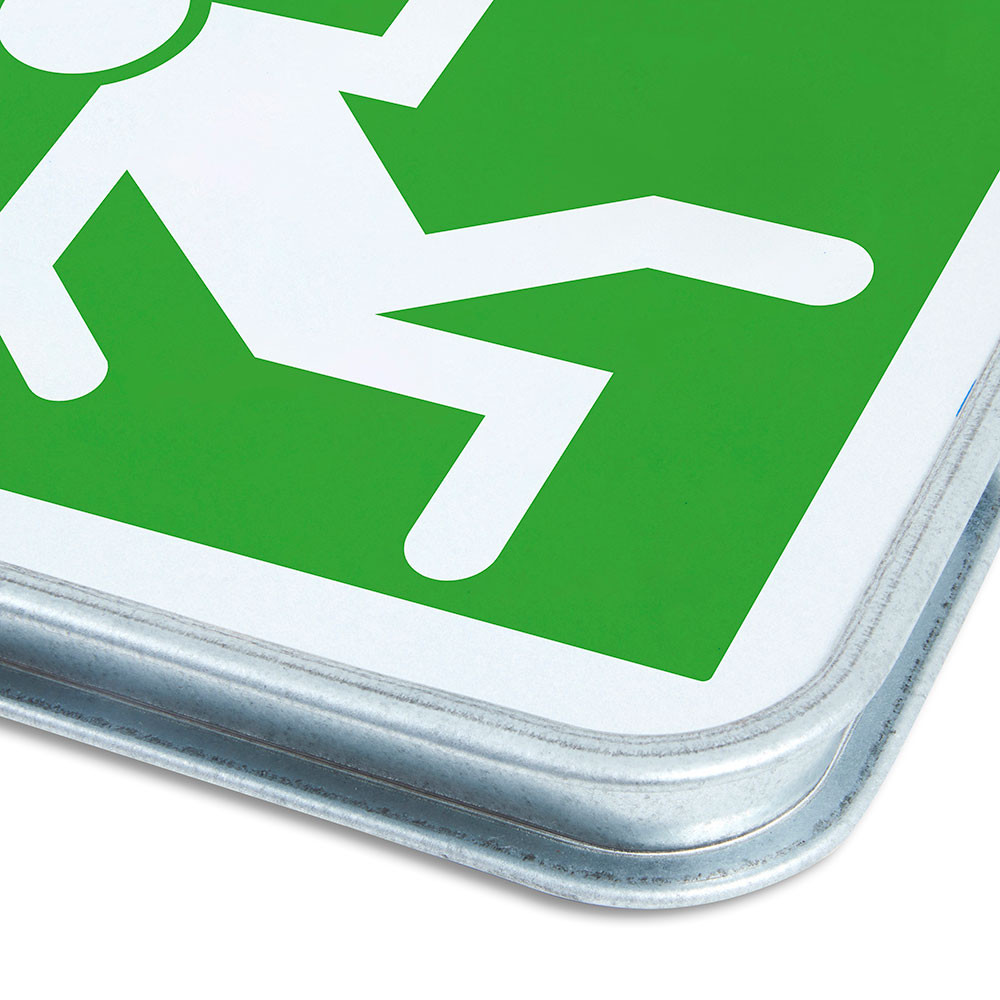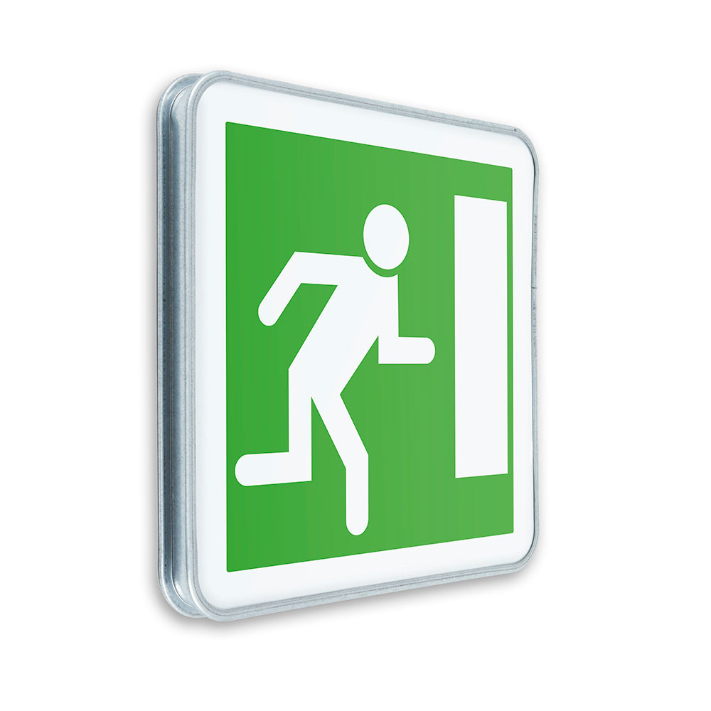 Panneau routier indiquant une issue de secours vers la droite d'un pont ou d'un tunnel. Panneau de type police en classe 1 ou classe 2.