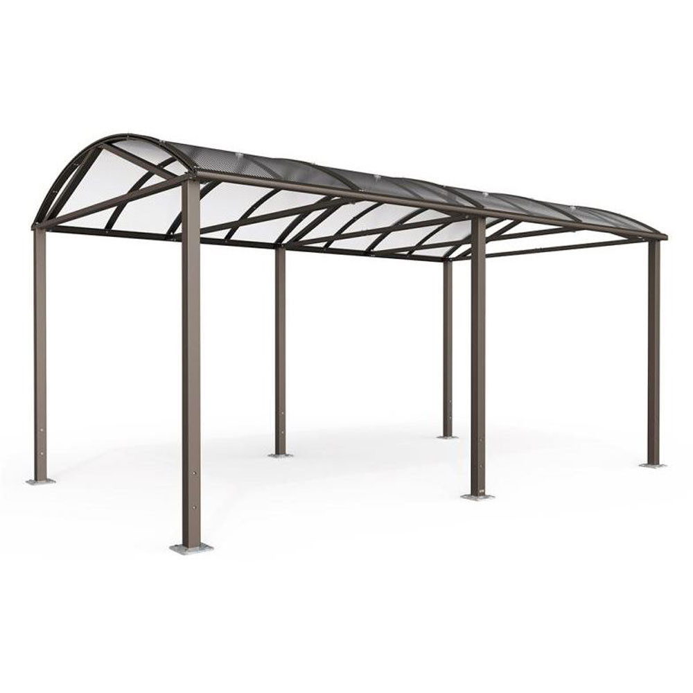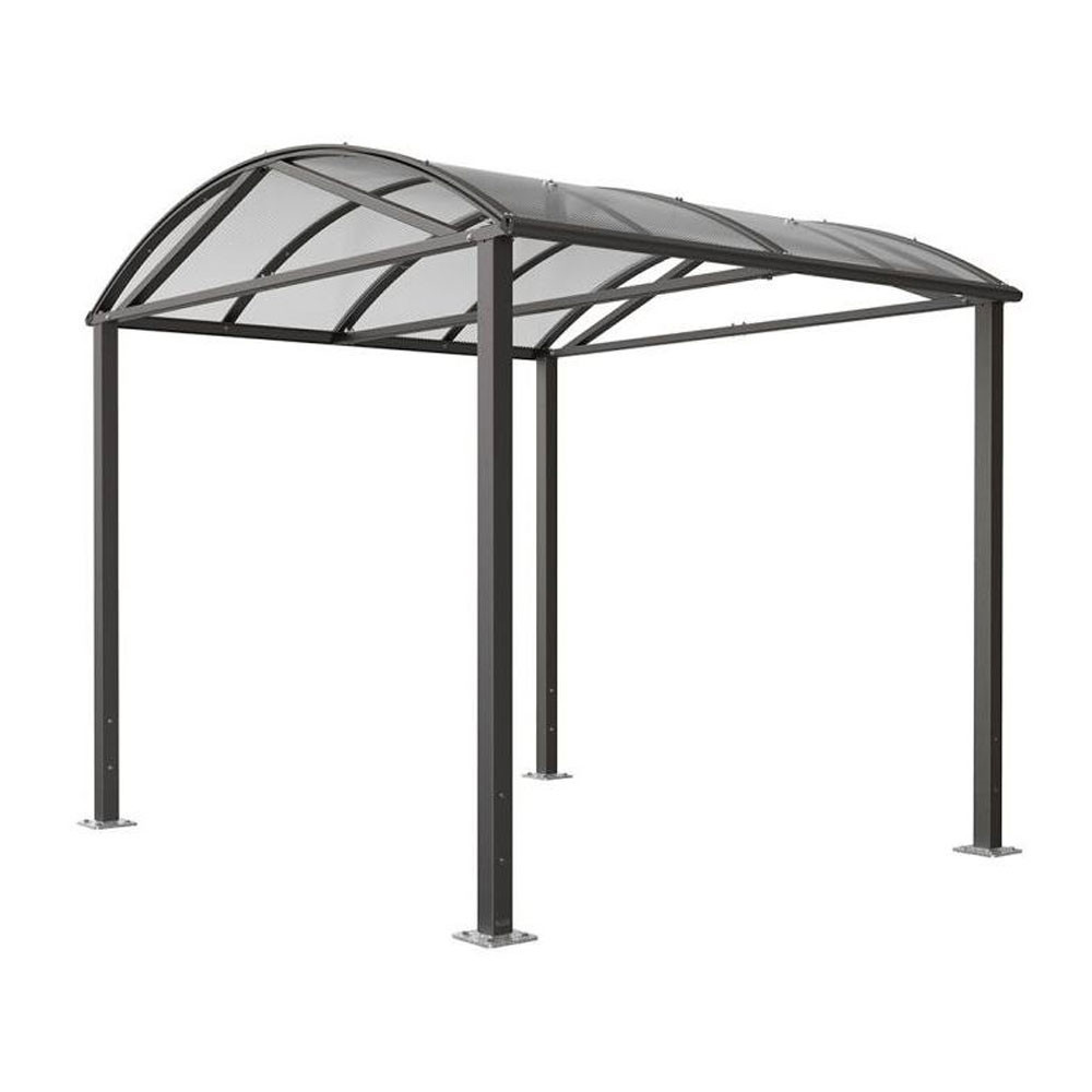 La structure repose sur des poteaux acier 80 x 80 mm, avec voûte en traverses aluminium et panneaux en polycarbonate alvéolaire 10 mm traité anti-UV. Il peut être équipé en option de bardages latéraux pour une meilleure protection : en polycarbonate alvéolaire (10 mm). Pose facile sur platines avec pieds réglables.