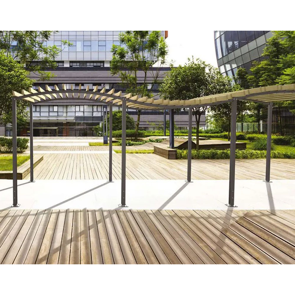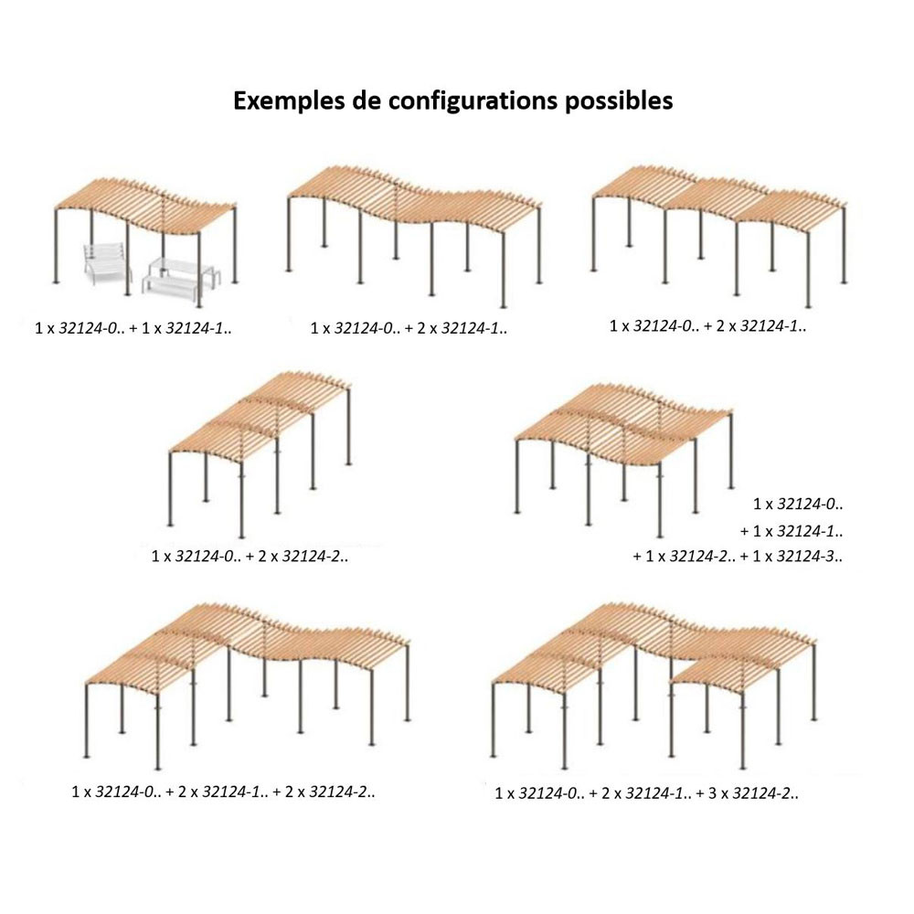 La pergola vague modulable est idéale pour créer des zones d’ombre élégantes et fonctionnelles dans les espaces publics ou les aménagements urbains. Grâce à sa toiture en lames de bois et à sa structure en acier peint, elle apporte une touche esthétique et naturelle à vos projets d'aménagement extérieur.