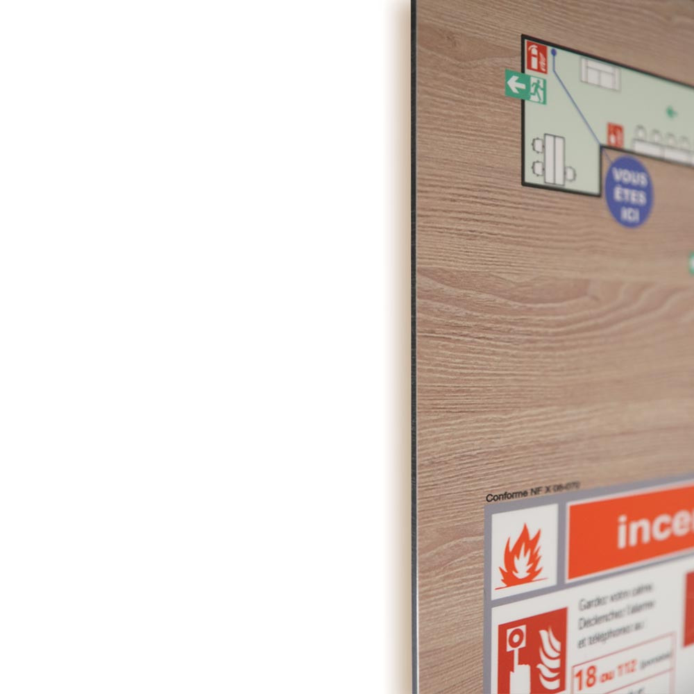 - Conformité aux normes en vigueur pour la signalétique de sécurité incendie.