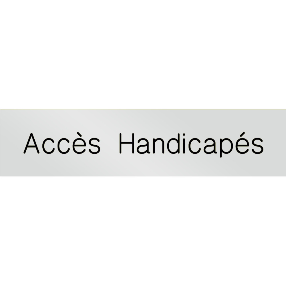 Découvrez la signalétique en métal gravé avec texte « Accès Handicapés ». Conçue pour répondre aux normes d’accessibilité, cette plaque permet d’indiquer clairement un accès adapté aux personnes à mobilité réduite. Son design en métal gravé lui confère une excellente durabilité et une finition soignée. La gamme Métal se décline en deux coloris élégants : argenté et doré.