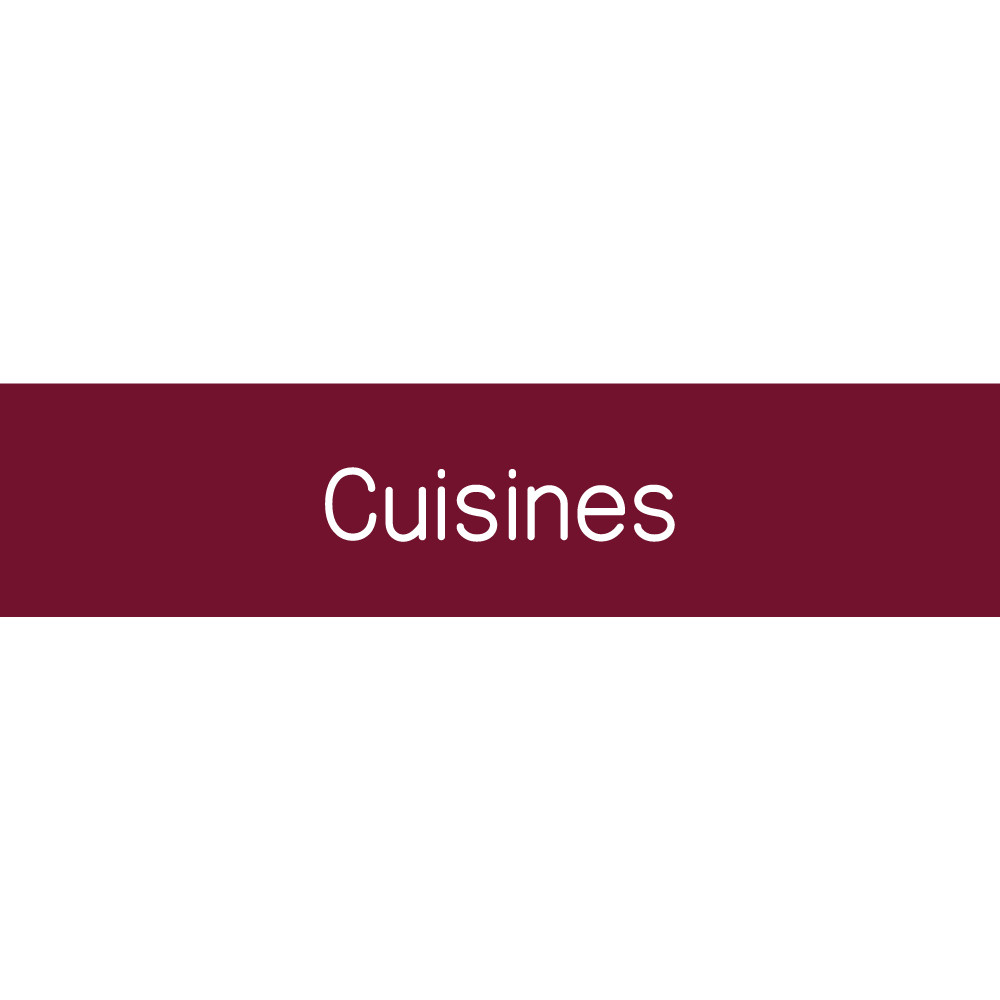 Découvrez la signalétique en PVC gravé gamme Couleur avec texte « Cuisines ». Disponible en 10 coloris modernes, cette plaque est conçue pour une lisibilité optimale avec une écriture blanche ou noire contrastée, respectant les normes d’accessibilité.