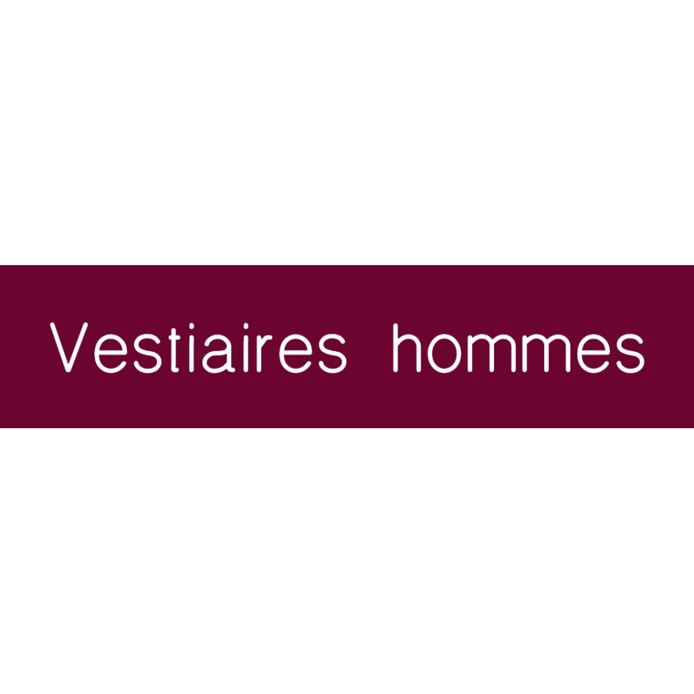 Découvrez la signalétique en PVC gravé gamme Couleur avec texte « Vestiaires hommes ». Disponible en 10 coloris avec écriture blanche ou noire contrastée pour une lisibilité optimale et conforme aux normes d’accessibilité. La gamme Couleur existe également en version Métal (argenté et doré) pour une finition plus élégante.