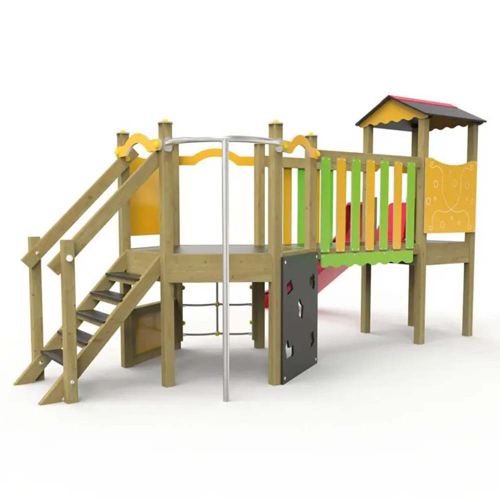 Elle se compose de deux tours (dont une avec toit), d’un toboggan, d’un pont, d’un filet d’escalade, d’un mur